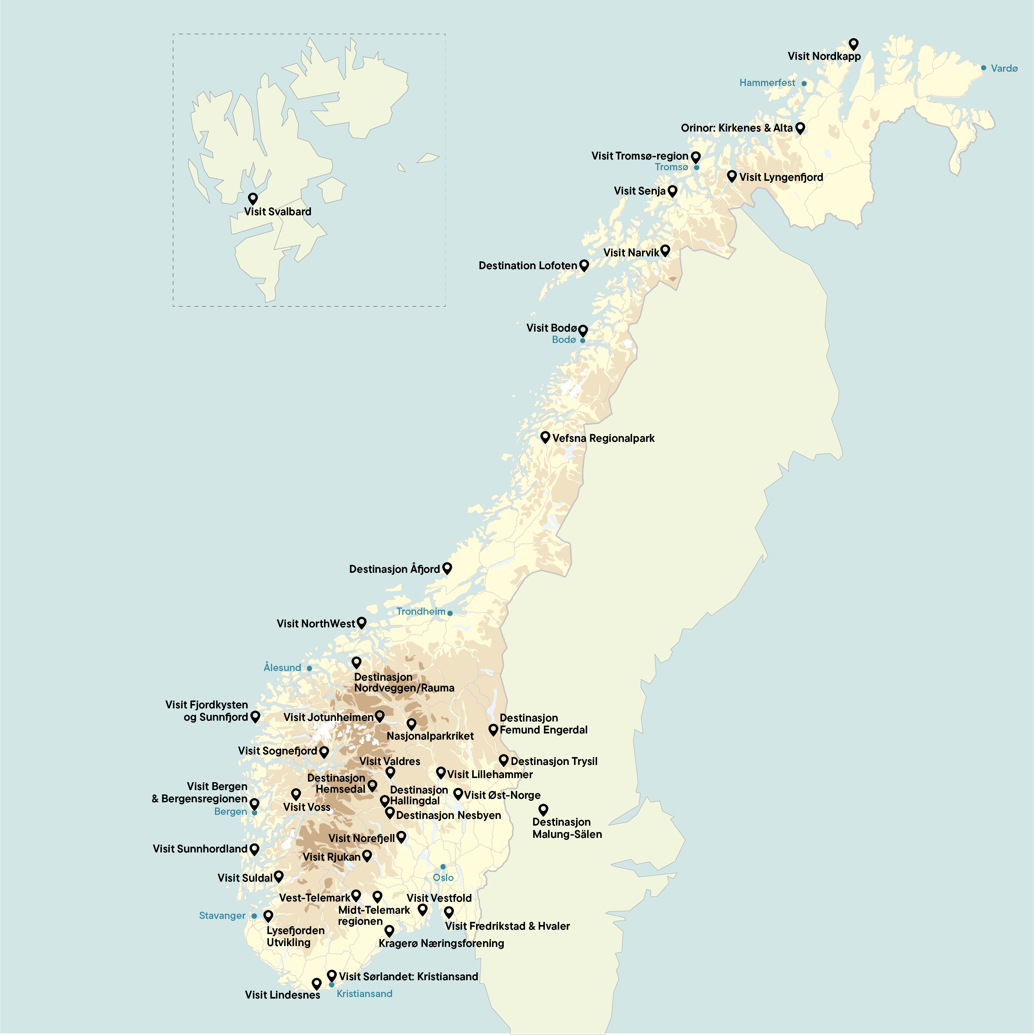 Sunnfjord, Visit Fredrikstad & Hvaler, Hallingdal næringshage, Hemsedal, Visit Jotunheimen, Kragerø Næringsforening, Visit Sørlandet, Visit Lillehammer, Visit Lindesnes, Destination Lofoten, Visit Lyngenfjord, Lysefjorden365, MTNU/Visit MidtTelemark, Malung-Salen, Visit Narvik, Nasjonalparkriket, Visit Nesbyen, Visit Nordfjord, Visit NorthWest, Visit Norefjell, Orinor/Visit Kirkenes & Alta, Nordveggen/Visit Rauma,