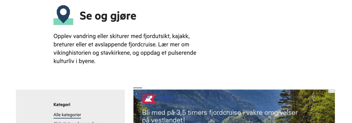 - Effektive innhaldsplasseringar: Våre annonsørpakkar gir synleghet gjennom bannerannonse på kampanjesider, artiklar, landingssider for overnatting, mat og drikke, aktivitet, eller forsider.